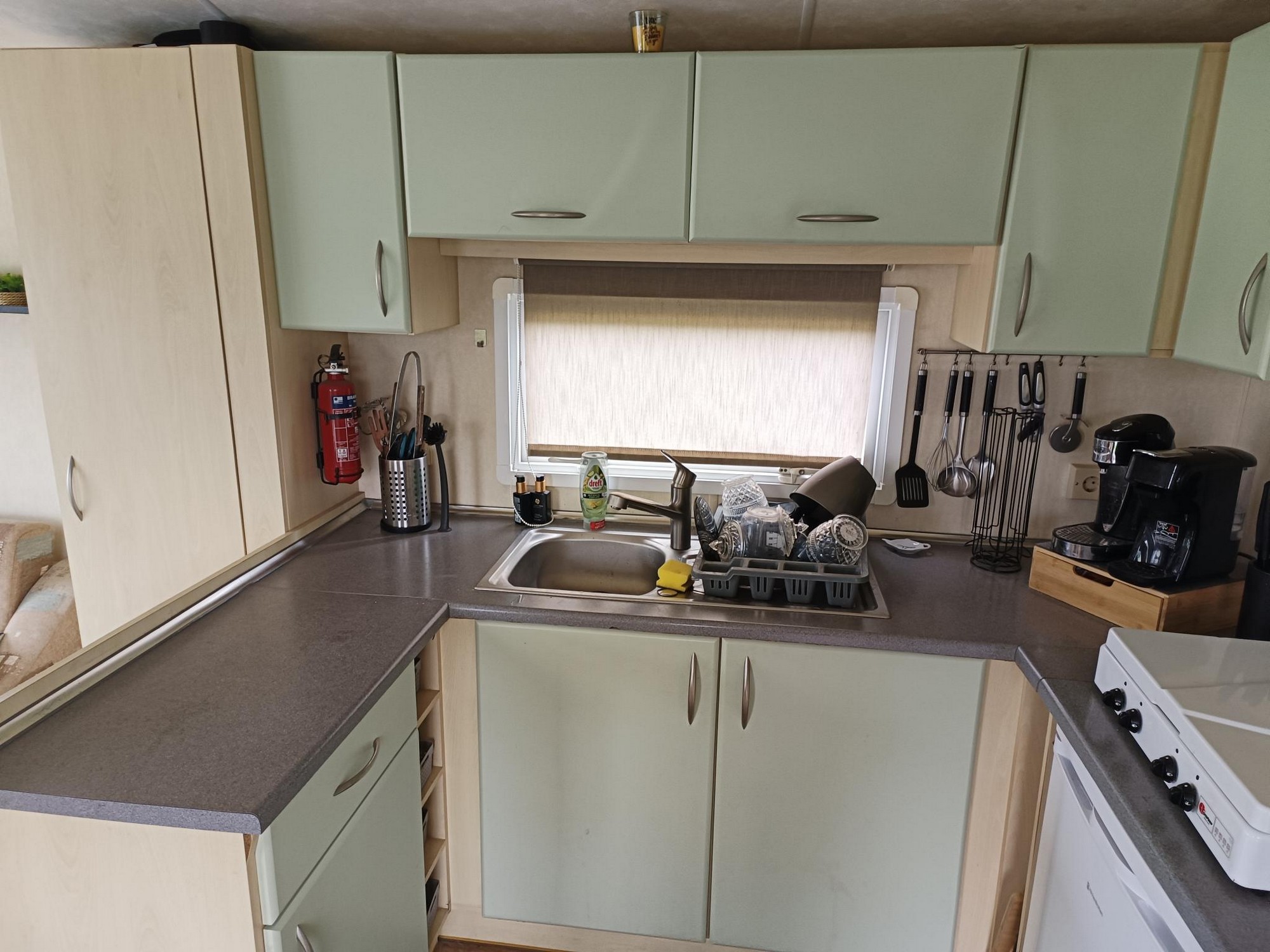 - De hele stacaravan is voorzien van rolgordijnen en/of normale gordijnen.